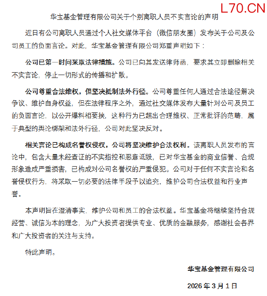 华宝基金声明:个别离职人员发布的负面言论不实 已向其发送律师函