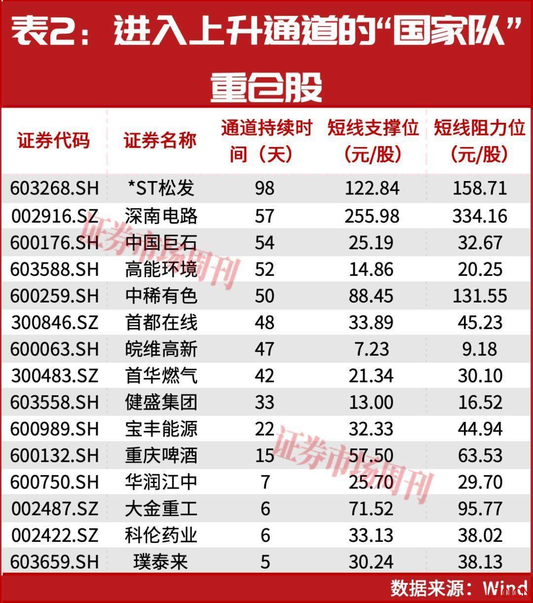 此外,在上升通道持续较长的“国家队”重仓股还有中国巨石、高能环境、中稀有色、首都在线、皖维高新等(见表2)。