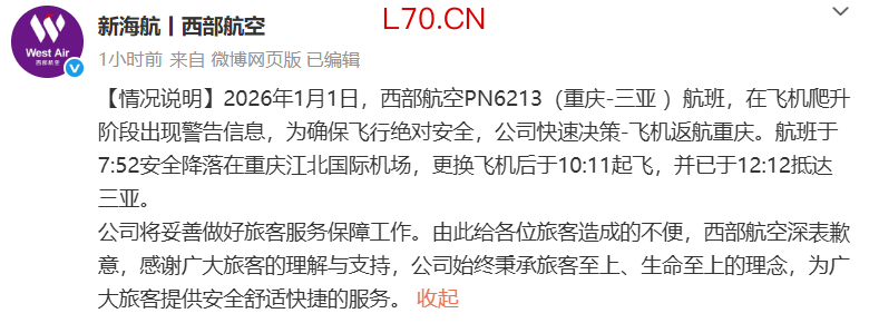 西部航空通报一客机紧急返航:飞机爬升阶段出现警告信息