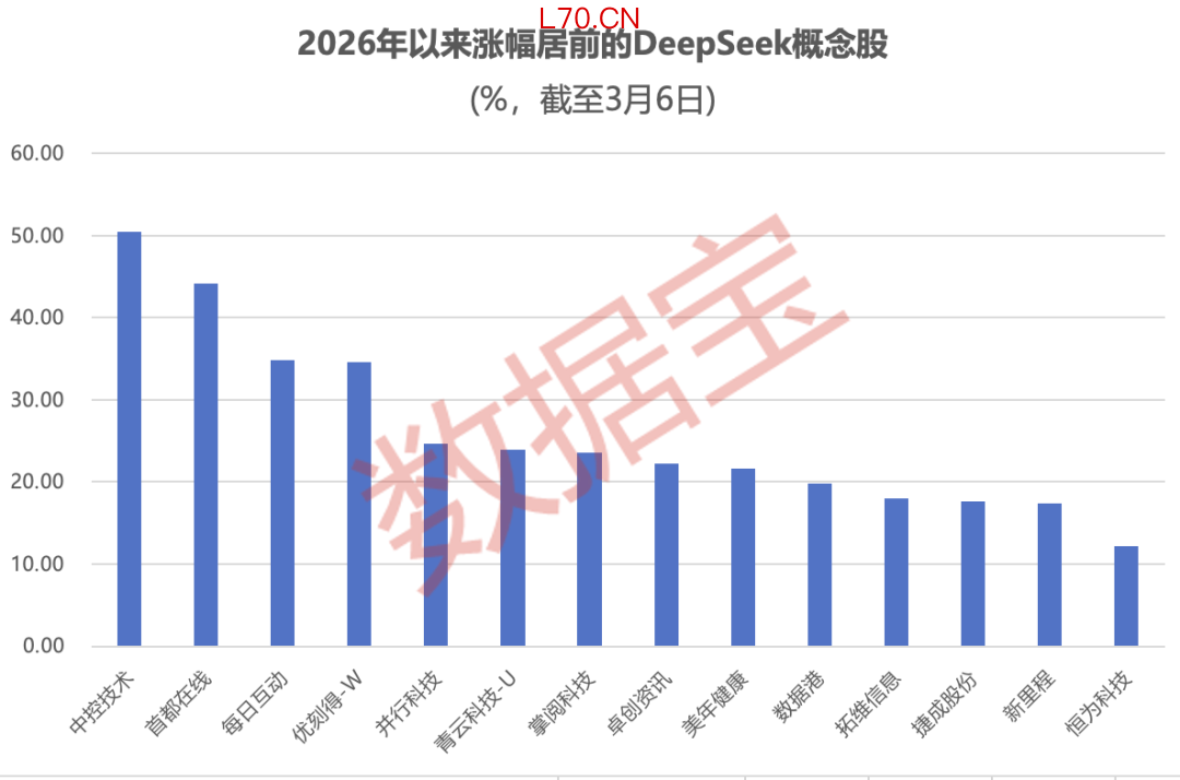 根据万得数据,截至3月6日,A股DeepSeek 45只概念股今年以来平均涨幅超过6%,整体跑赢上证指数。14只概念股今年以来累计涨幅均超过10%,中控技术、首都在线、每日互动、优刻得-W累计涨幅均超过34%。