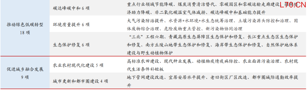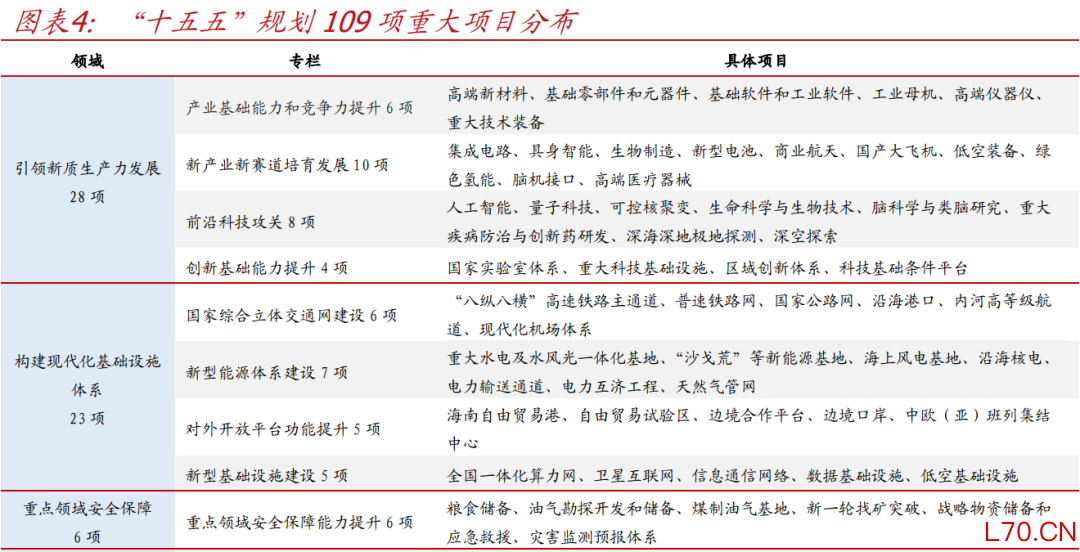 突出“战略性、牵引性和连续性”,109项重大项目包括新质生产力(28项)、现代化基建(23项)、城乡融合发展(9项)、保障和改善民生(25项)、绿色低碳转型(18项)、安全保障(6项),我们也结合纲要中专栏做了相应梳理罗列(详细清单见下表4)。其中,相比于“十四五”102项重大项目,科技及基建类重大项目明显增加,更为突出支持新产业新赛道培育、新型能源体系、对外开放平台建设等;也包括雅下水电工程、三峡水运新通道、卫星互联网等一系列基础性标志性项目,兼顾当前和长远,既涉及“硬投资”也包含“软建设”。此外,多项重大项目已明确建设规模,如“十五五”地下管网建设改造,要“建设改造城镇燃气管网约20万公里、排水管网约17.5万公里、供水管网约17.5万公里、污水管网约10万公里、供热管网约12万公里”等。