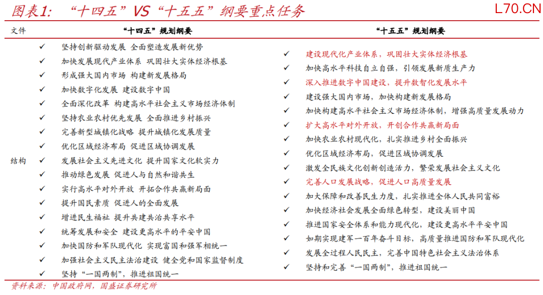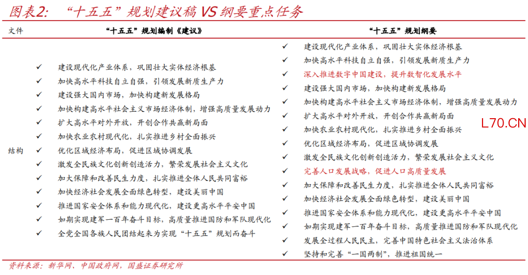 1、总体看,“十五五”规划纲要突出新阶段、新形势、新任务,对比规划建议稿,新增数智化及人口发展战略;对比“十四五”规划纲要,强产业移至首位、开放次序前移、也新增数智化及人口发展战略。
