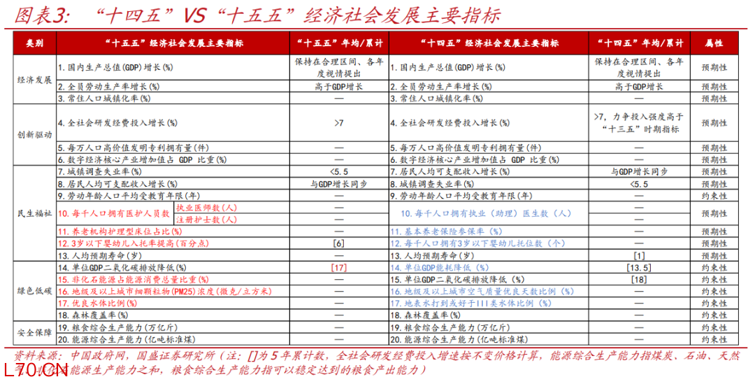 看点1:“十五五”20项主要指标考核紧扣高质量发展,“统筹需要和可能、数量和质量”,并优化了民生和绿色低碳领域指标。