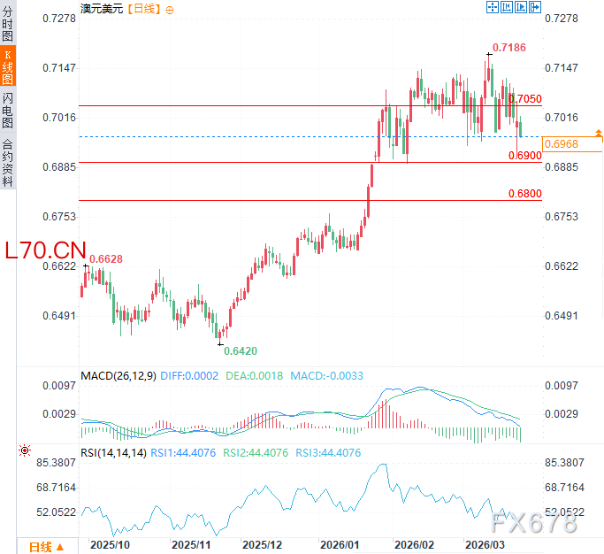 汇通财经APP讯——周二(3月24日)亚市时段,澳元表现疲软,兑主要货币普遍走低,澳元兑美元震荡走低,目前该货币对交投于0.6970附近,日内跌幅约0.6%。伊朗方面强硬否认与美国进行和平谈判,与美国总统特朗普此前乐观表态形成鲜明对比,重燃市场风险厌恶情绪,导致澳元承压。风险偏好下降提振美元表现,美元指数小幅回升至99.40附近,日内涨幅约0.2%。澳元作为典型的风险敏感货币,在地缘不确定性加剧时往往面临较大卖压。