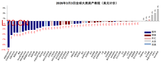 受此影响,全球资产反应剧烈,仅大宗商品、比特币和美元上涨(图表2)。供给风险推动原油和天然气领涨,布伦特原油上涨26%突破90美元/桶;美元指数则逼近100。权益资产普跌,新兴市场和欧洲跌幅最大,年初以来领跑的韩国市场以13%的跌幅领跌,法国和德国紧随其后,A股和美股反而更抗压;短期流动性紧张给传统避险资产黄金和美债也带来抛售压力,美债利率由3.9%抬升20bp至4.1%,黄金由5100美元回落至5000美元附近,3月3日盘中一度回调5%。上周的整体表现依然是符合地缘冲突历史规律的,尤其是2022年俄乌冲突初期,即大宗商品和比特币领涨、美元走强、权益类市场普跌后逐步修复、欧洲股市领跌。