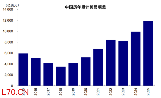 图表21:2025年中国全年累计贸易顺差接近1.2万亿美元,为历史最高值