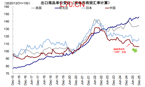 在内需偏弱、产能和库存压力无法完全消解的情况下,外需对中国经济的重要性就被强化了。2025年中国全年累计贸易顺差接近1.2万亿美元,为历史最高值(图表21)。外需韧性的背后,固然有海外需求相对较强的因素,但也与中国企业的价格优势息息相关。自2025年4月“对等”关税以来,美国、欧元区和日本出口单价(按本币有效汇率计算)变动幅度为-3.6%、1.3%和-4.0%,但中国变动幅度达到-8.0%(图表22)。