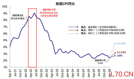 ► 油价如何影响美国通胀?当前美国整体CPI为2.4%,核心CPI为2.5%,在伊朗局势之前,我们预计美国整体CPI同比高点为2.8%,出现在二季度左右,并非一个大问题,也不妨碍美联储降息(图表16)。根据美联储对油价影响美国CPI能源项[9]与核心项[10]的研究,以及油价冲击对发达经济体CPI的传导效应分析[11],我们测算,油价每上涨10%将推高美国整体CPI约0.2-0.3个百分点,这意味着,根据上文针对霍尔木兹海峡不同的情形分析,如果二季度油价中枢在80美元/桶附近,美国CPI的同比高点可能抬高至3.1-3.2%;如果二季度油价中枢达到120美元/桶附近,美国CPI的同比高点可能抬高至4.2-4.9%(图表17)。同比高点大概率依旧出现在二季度。