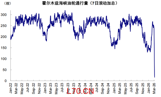 2026年2月28日,美国与以色列对伊朗境内目标发动军事打击[1],随后当晚伊朗伊斯兰革命卫队宣布,禁止任何船只通过霍尔木兹海峡[2],3月2日伊斯兰革命卫队指挥官表示“任何试图通过霍尔木兹海峡的船只都会被击毁”[3]。从实际结果看,截至3月8日,MarineTraffic实时海运图显示海峡两侧已经出现了明显的油轮积压,Bloomberg统计的滚动7日通行量从冲突爆发前的240艘下降94%至16艘,基本陷入停滞(图表1)。