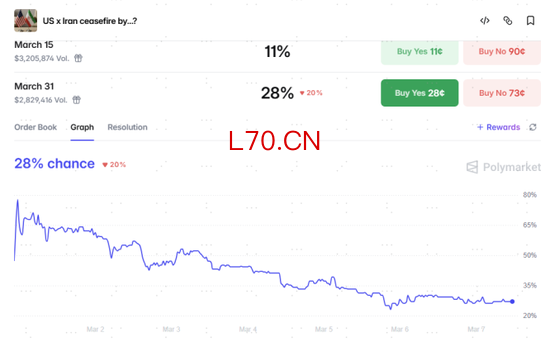 图表3:Polymarket博彩数据显示市场预期3月底停火的概率已经由78%下降至28%