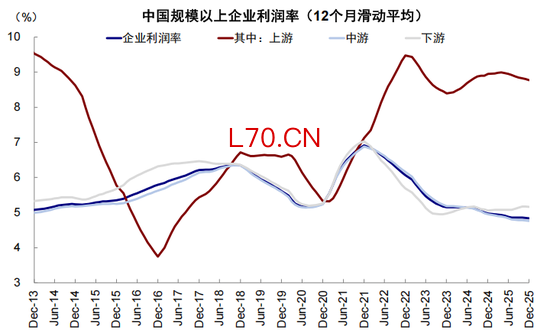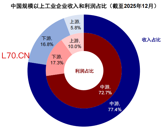 中国工业库存压力自2025年四季度以来再度抬升,工业和制造业库销比分别从2025年9月的1.37和1.51抬升至12月的1.40和1.55(图表18),这表明产能和去库存压力反而有加大迹象,也体现在中游企业利润率下降上。中国规模以上工业企业利润率自2022年以来逐步下降,近期相对平稳但仍未扭转下行趋势,截至2025年12月利润率仅4.8%(图表19)。分结构看,中游企业是中国工业企业的主体,收入占比和利润占比分别达到77.4%和72.7%(图表20);但利润空间也是最窄的,2025年12月利润率仅4.8%。