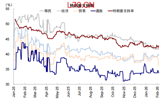 因此,在油价高位震荡的情形下,通胀大概率会走高并导致降息推后,这又会带来一连串的影响,如美债利率居高不下,压制成长股估值,导致寄希望于融资降低而修复的地产和制造业再度承压(图表13),甚至影响特朗普的中期选情(特朗普的支持率已经从就任初期的52%持续降至当前的43%,通胀议题的支持率则最低)(图表14)。但不论如何,美联储依然可以一定程度上“越过”(look through)短期扰动,将注意力放在长期增长上,如2月爆冷的非农数据,换言之,降息是延后而非逆转,所以这种情形下整体影响拉长看仍是可控的。