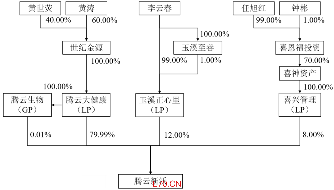 腾云新沃是一家新成立的合伙企业,世纪金源的全资子公司腾云生物、腾云大健康分别担任腾云新沃的执行合伙人、普通合伙人,持有其0.01%、79.99%的股权。沃森生物现任董事长李云春通过玉溪正心里,持有腾云新沃12%的股权,投资机构喜神资产通过喜兴管理,持有腾云新沃8%的股权。