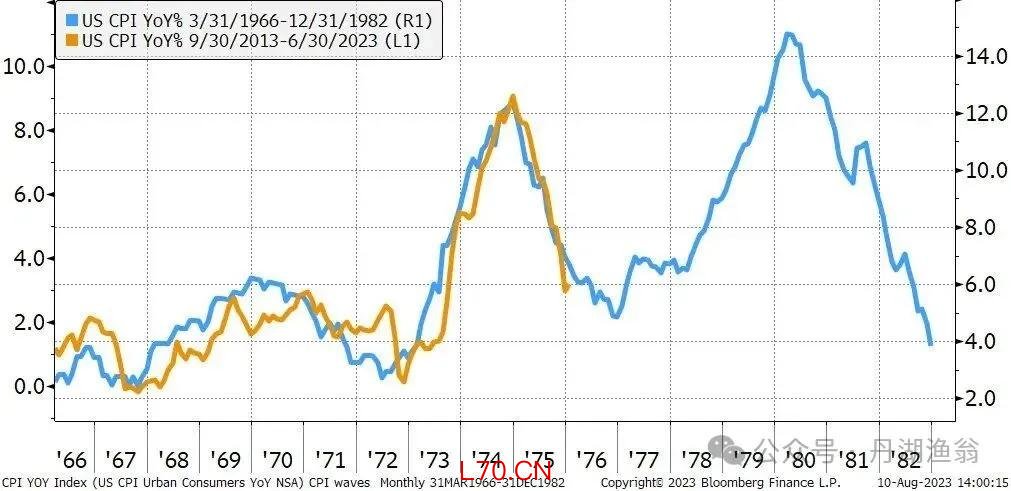 文中提到,2023年8月24日,美国前财政部长、哈佛大学前校长、经济学家Lawrence H. Summers在X上发了下面这张图4。图中蓝色曲线是1966年3月-1982年12月CPI同比(右轴),黄色曲线是2013年9月至2023年6月美国CPI同比(左轴)。两者几乎完全重合。